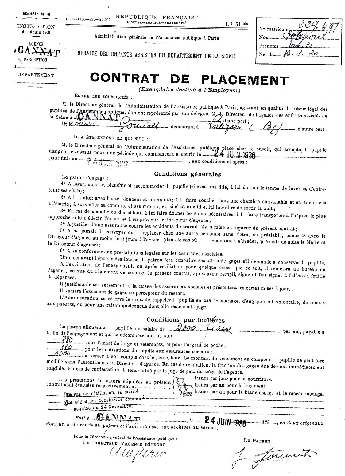 Exemple d’un contrat de placement daté de 1936 qui illustre les conditions dans lesquelles les enfants mineurs, filles ou garçons, étaient placés. Le plus souvent dans des fermes du Morvand, de l’Allier, de la Nièvre et du Cher.